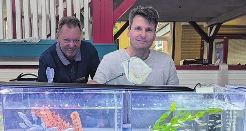 Dietmar Kopka (links) und Paul Witt geben auf der Zierfischbörse in Wustrow Einblicke in ihr Hobby: die Zierfischhaltung.